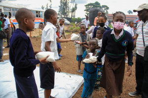 Accompagné par des milliers d’élèves des différentes écoles de Goma, Mgr Henri Chiza a jeté les dés en partageant l’assistance – un sachet d’haricot- avec une élève vivant au camp des déplacés à Turunga, un autre site à part celui de Kanyaruchinya où les déplacés ont élu domicile. Devant une foule de petits enfants, l’émotion était grande. On pouvait voir certains sans babouches, habits déchirés ou culotes… ravis de recevoir l’assistance.